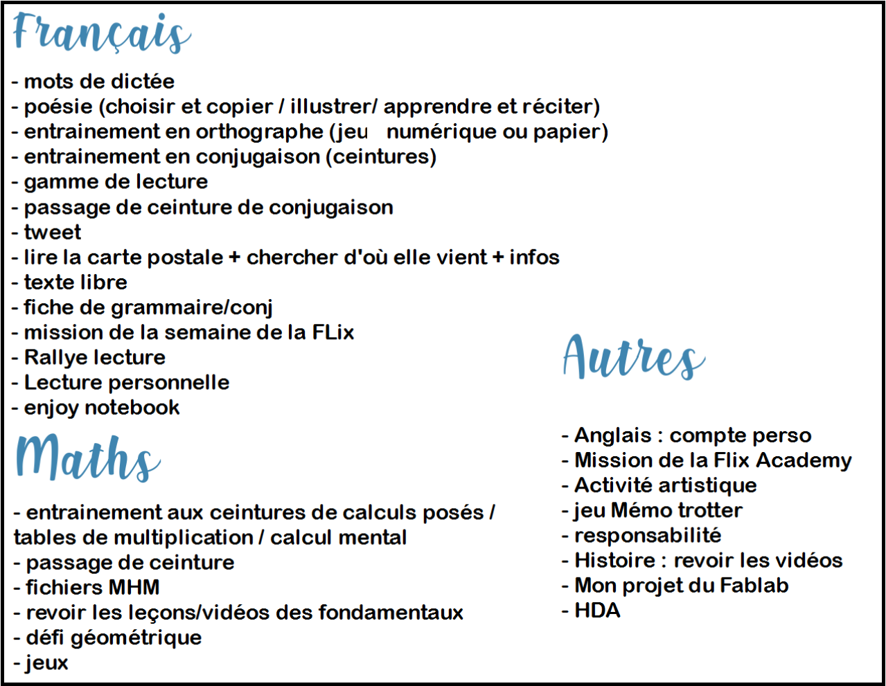 Je n’avais pas envie de me contenter de ces 4 ceintures pour les plans de travail, donc en novembre nous avons listé des activités réalisables pendant ces temps de travail autonome. Il ne s’agit que d’activités d’entrainement, de révision. Si vraiment je veux mettre quelque chose pour une nouvelle notion à venir, ce sera une question pour recueillir leurs représentations (en sciences par exemple) ou une vidéo pour aborder la notion (comme en pédagogie inversée).